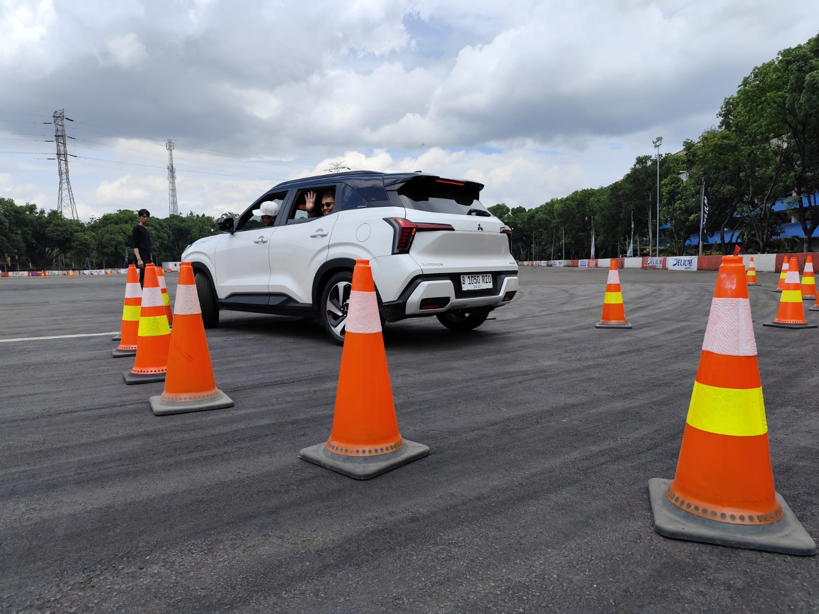 Keseruan lainnya, challenge mundur pakai Mitsubishi Xforce Ultimate DS. Enggak hanya itu, tapi saat mundur enggak boleh kena kun. Games ini untuk mengetahui skill pengendara jika mundur hanya menggunakan pandangan kamera belakang saja.