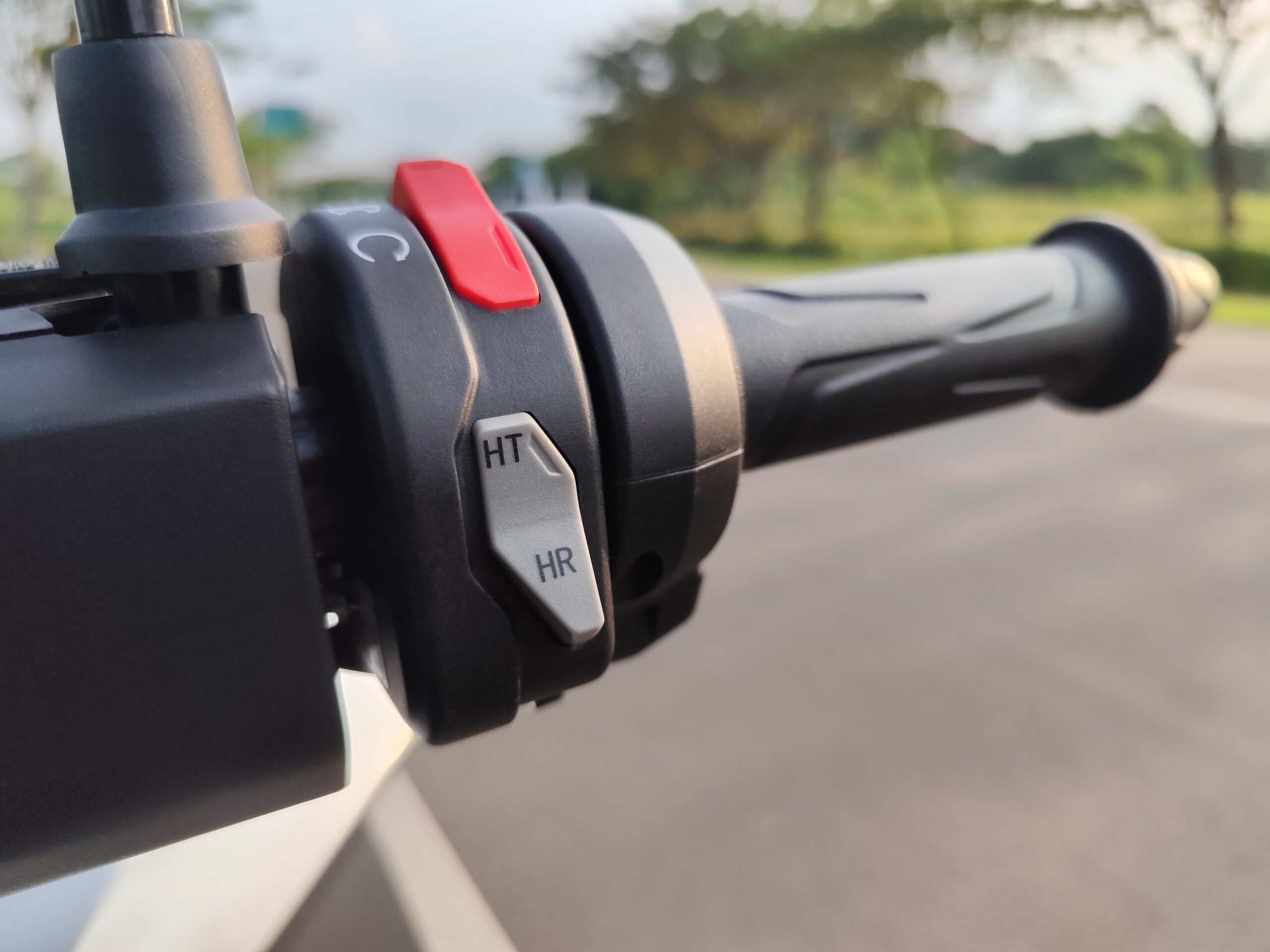 Kemudian, Maka Cavalry ini punya beberapa fitur yang cukup menarik untuk di motor. Di stang bagian kiri, standar saja. Ada untuk sein, lampu utama, klakson, R (reverse) dan juga hazard.