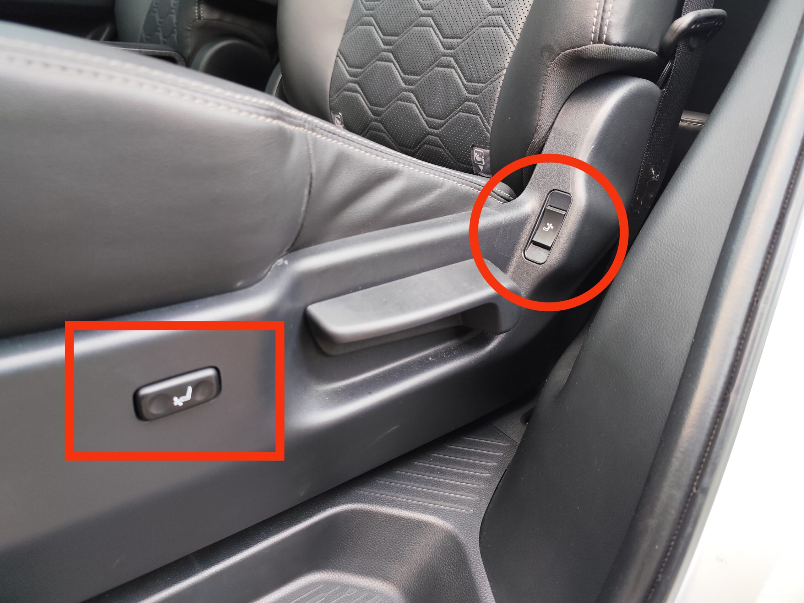 Tombol dalam kotak, untuk pengatur peyangga betis. Dalam lingkaran untuk mengatur sandaran jok (foto : toncil)