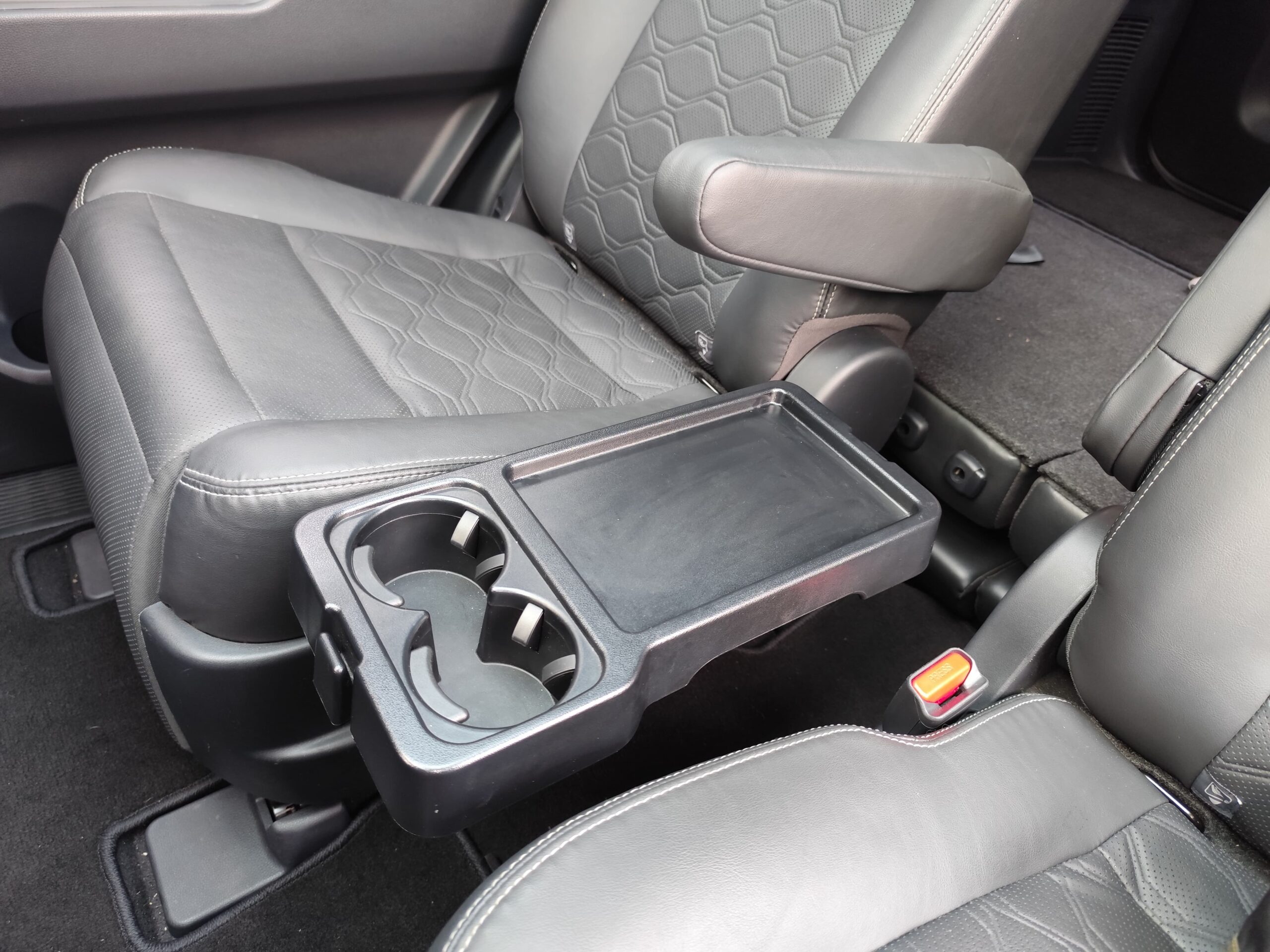Di captain seat kanan, ada meja yang bisa dilipat. Terdapat 2 cup holder supaya gelas minuman enggak perlu dipegang terus.