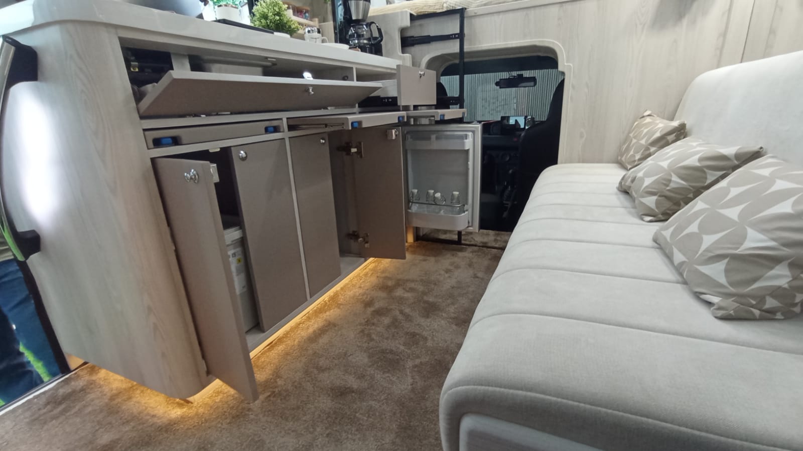 Selanjutnya juga tersedia lemari yang dimensinya agak besar. Di bagian bawahnya ada meja yang bisa ditarik. Di situ bisa untuk memotong daging atau sayuran ketika kemping.